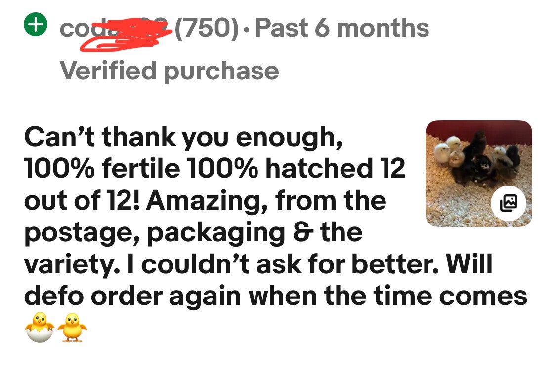 Before bidding anywhere else check their listing for how many cockerels to hens ratio they have as most have one or two running around, this will have an effect on the fertility rate of the eggs, Don't just blame the postal services although some times it does have an effect espacially if the eggs are excessively shaken. We have 8-9 cockerels of different breed to 13 hens which makes a big difference to the fertility rate, see our pictures