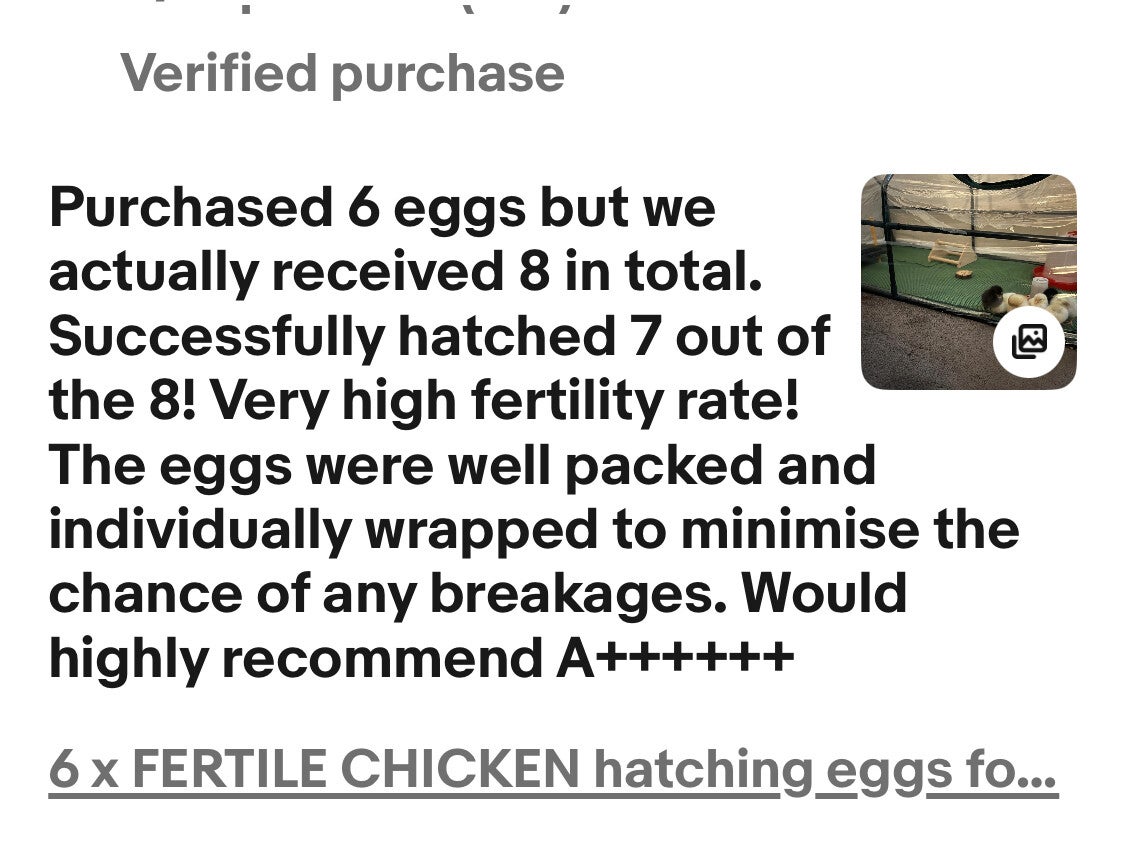 Before bidding anywhere else check their listing for how many cockerels to hens ratio they have as most have one or two running around, this will have an effect on the fertility rate of the eggs, Don't just blame the postal services although some times it does have an effect espacially if the eggs are excessively shaken. We have 8-9 cockerels of different breed to 13 hens which makes a big difference to the fertility rate, see our pictures